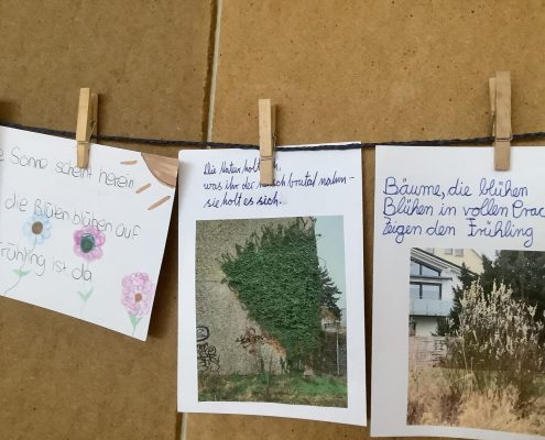 Im Klassenzimmer wieder angekommen, wird zunächst erklärt, was ein japanisches Haiku ist: Ein Gedicht mit strengem Bauplan. Der Bauplan sieht so aus, dass es in der ersten Zeile 5 Silben, dann 7 und danach wieder 5 Silben gibt. Es stellt sich heraus, dass die abwechslungsreiche Aufgabe draußen dafür wichtig war, zu der individuellen Fotografie, ein Haiku zu schreiben. Das Haiku soll dann in das Klassenzimmer, welches zum Thema „Kirschblüten“ dekoriert wird, aufgehängt werden. Einige Kinder freuen sich und flüstern ihrem Sitznachbar oder den Freunden zu: „Das wird bestimmt ein sehr einzigartiges Gedicht, weil ja jeder ein eigenes Bild hat. Es macht bestimmt Spaß alles am Ende auszutauschen.“ Obwohl es einige Wenige gibt, die sich weniger freuen, machte das Ganze doch allen Spaß. Und so geht die etwas andere Deutschstunde zu Ende.