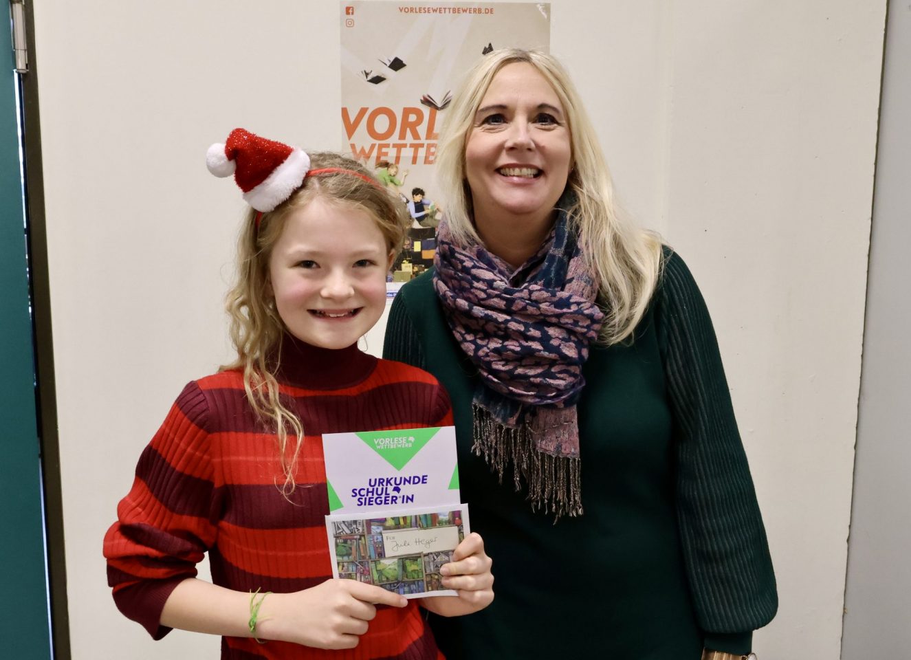 Frau Kaiser gratulierte Jule Heger mit einem Buchgutschein und die Schulgemeinschaft drückt Jule die Daumen für die nächste Wettbewerbsebene, den Regionalentscheid.