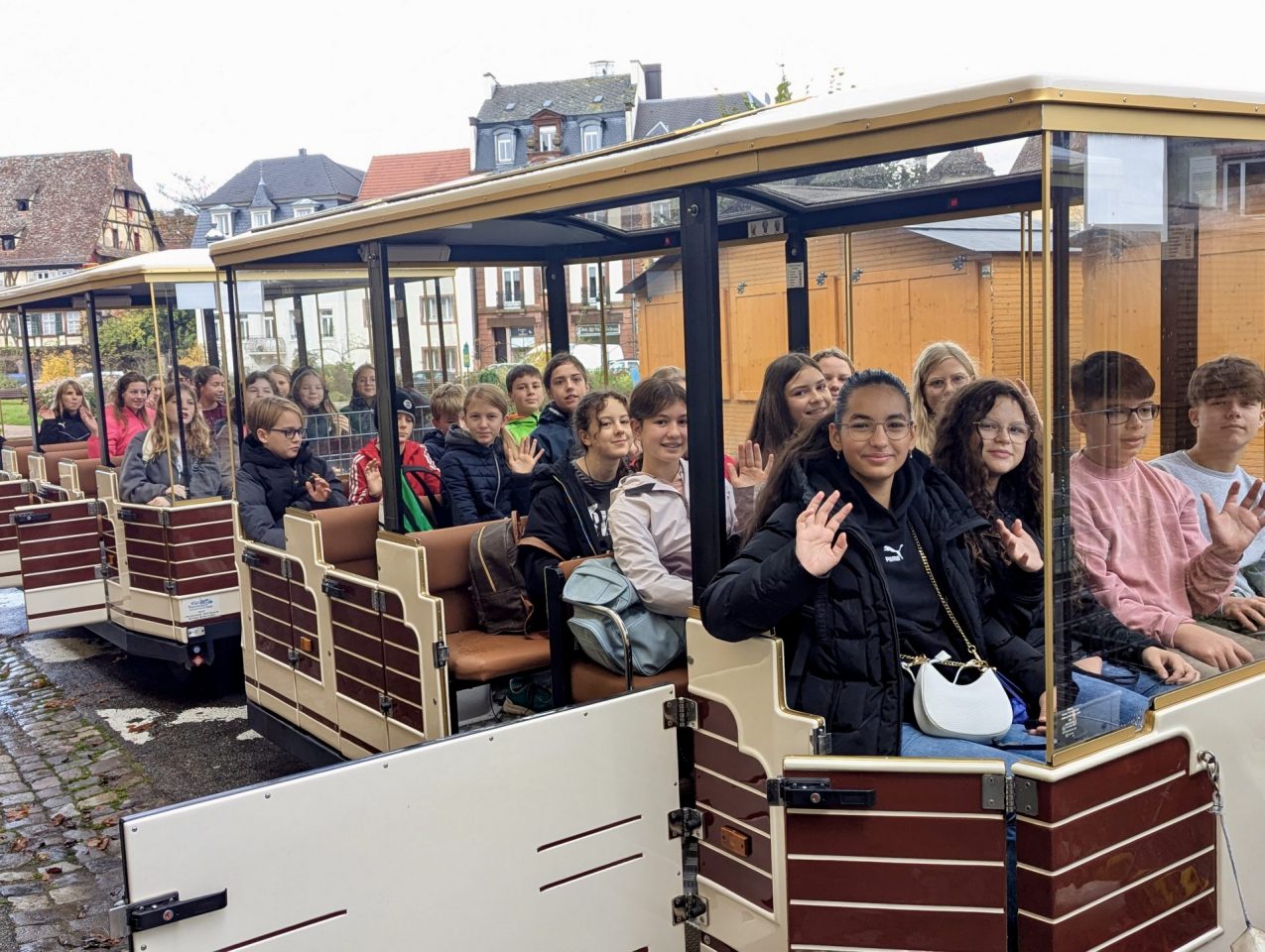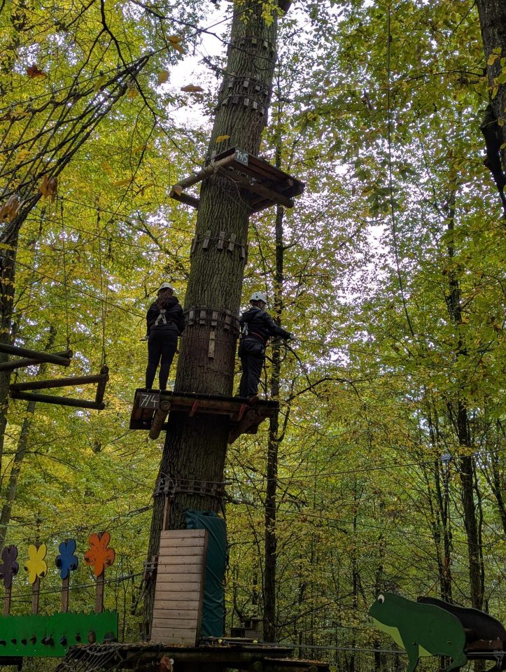 Wir, die Klasse 7b, waren vom 20.10.25 – 24.10.25 im Landschulheim in Bad Bergzabern in Rheinland – Pfalz. Trotz des überwiegend mäßigen Wetters ließen wir uns die gute Laune nicht nehmen und erlebten viel. Zum Beispiel belegten wir Montag und Dienstag einen Theaterworkshop mit vielen lustigen Spielen und kleinen Theaterstücken, die wir selbst einübte. Dadurch wurde uns der Tag versüßt . Am Mittwoch waren wir in einem Kletterwald. Das war für viele das Highlight, und obwohl es nieselte und alles feucht war,kletterten wir oben in den Baumwipfeln viele Routen von leicht bis schwierig und hatten dabei sehr viel Spaß. Das Klettern machte uns alle ziemlich hungrig und so durften wir uns ein Essen aussuchen, das aus der Klassenkasse bezahlt wurde. Am Abend machten wir es uns noch am Lagerfeuer mit leckerem Stockbrot gemütlich. Der krönende Abschluss unserer Klassenfahrt war eine Reise nach Frankreich am Donnerstag. Dort waren wir in der kleinen Stadt Wissembourg. Trotz der Kälte fuhren wir mit einem kleinen Bähnchen durch die Stadt. Im Anschluss durften wir alleine durch die Gassen laufen. Viele von uns kauften schöne Mitbringsel und wir hatten alle einen schönen Mittag. Abends gab es noch eine tolle Klassenparty, bei der wir gesungen,getanzt und genascht haben. Am Ende waren wir uns alle einig: Dies waren tolle 5 Tage, in denen wir viel Spaß hatten und unsere Klassengemeinschaft gestärkt wurde. Dafür wollen wir uns auch bei unseren Lehrerinnen bedanken, die das ermöglicht haben.