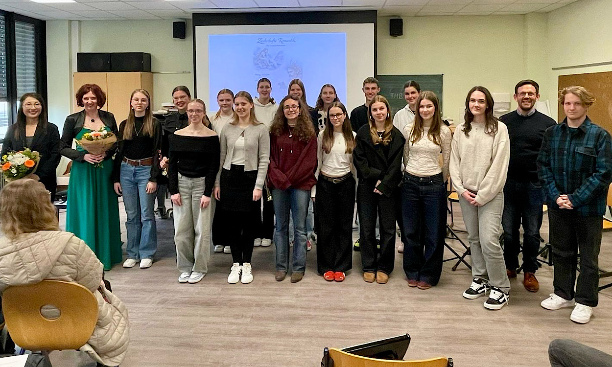 Auch Schülerinnen und Schüler wirkten aktiv am Programm mit. Die Musikleistungskurse sowie die Musikprofilklasse 10a präsentierten zwei Beiträge: „Das Lied der Lorelei“ (Text: Heinrich Heine, Musik: Friedrich Silcher), das gemeinsam mit dem Publikum gesungen wurde, sowie „Erlkönig“ (Text: Johann Wolfgang von Goethe, Musik: Johann Friedrich Reichardt), das in verteilten Rollen aufgeführt und von einem Instrumentalensemble begleitet wurde.